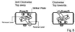 Assembling The Traverse Unit On To The Shaft. Adjust pitch setting at 10 on dial. Removing The Unit From The Shaft: The unit can be removed from shaft by rotating the shaft in opposite direction. 2) Reversal For the reversal, system to operate a minimum distance of travel equivalent approximately to diameter of the shaft is required. The reversal time is pitch related (see fig 6 ). Consequently, as the pitch is increased, there is a very slight increase in traverse stroke length (and decrease if the pitch is reduced). Difference in stroke length also occurs when shaft speed is varied significantly without altering the pitch. 3) Direction of Shaft Rotation and How to Modify Traverse Unit to Suit required Direction of Rotation of Shaft The reversal mechanism is dependent on direction of shaft rotation. For the reversal mechanism to operate shaft has to be rotated in correct direction of rotation. When shaft is rotated in correct direction the bearing end of the release lever points towards the direction of travel of the unit. If this is not the case, the reversal mechanism can be altered as described below. |